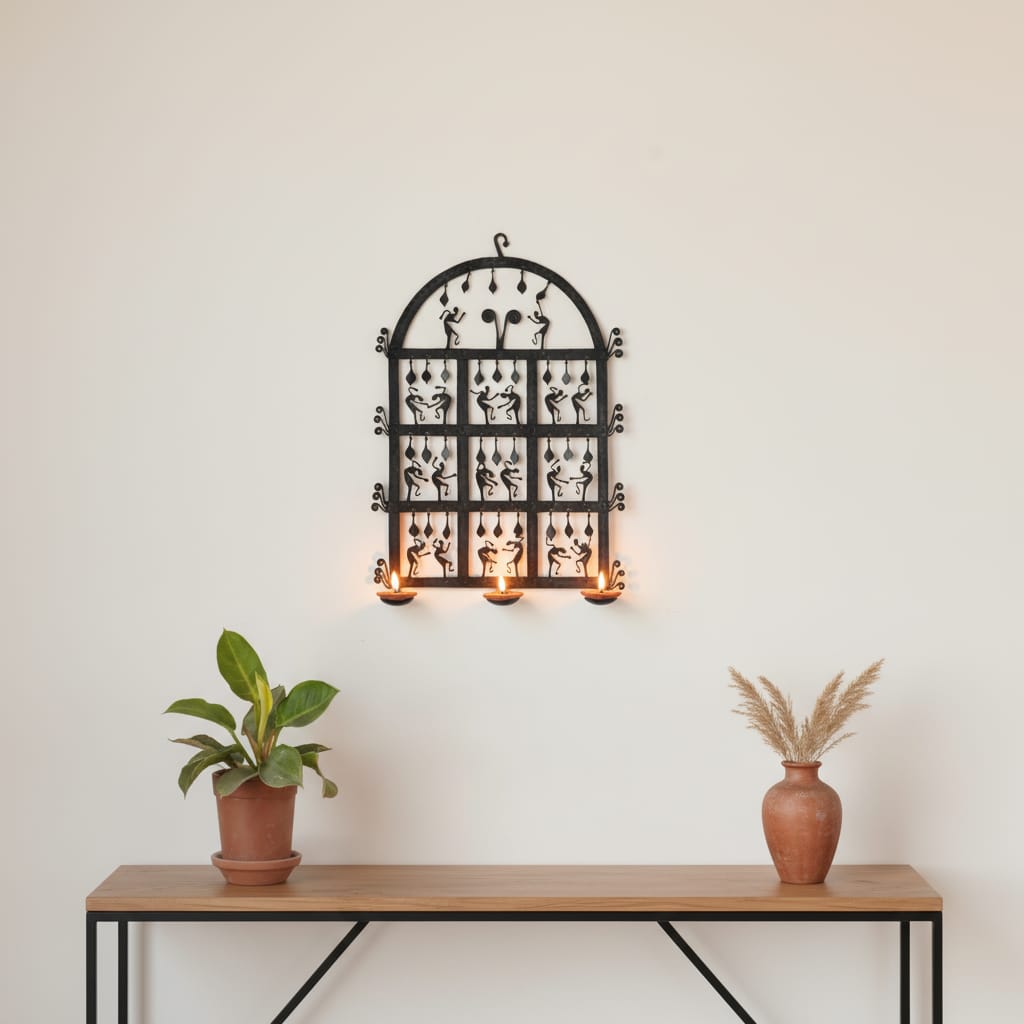 A stunning handcrafted long iron hanging diya from Bastar, adorned with intricate human and animal figurines inspired by nature. Foldable for easy handling, its sleek black finish blends tradition with modern elegance, making it a perfect centerpiece for your space.