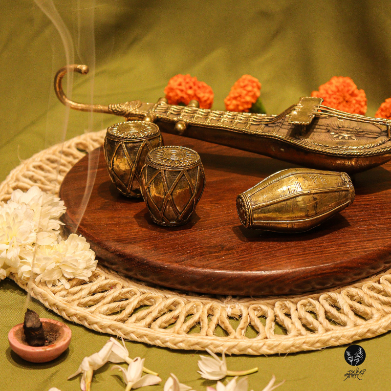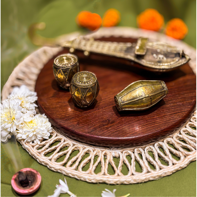 The set features three iconic instruments — a Veena, a pair of Tabla, and a Dholak — each cast in brass with delicate detailing and timeless form. Every curve, texture, and motif reflects the rhythm, soul, and artistry that music brings to life.
